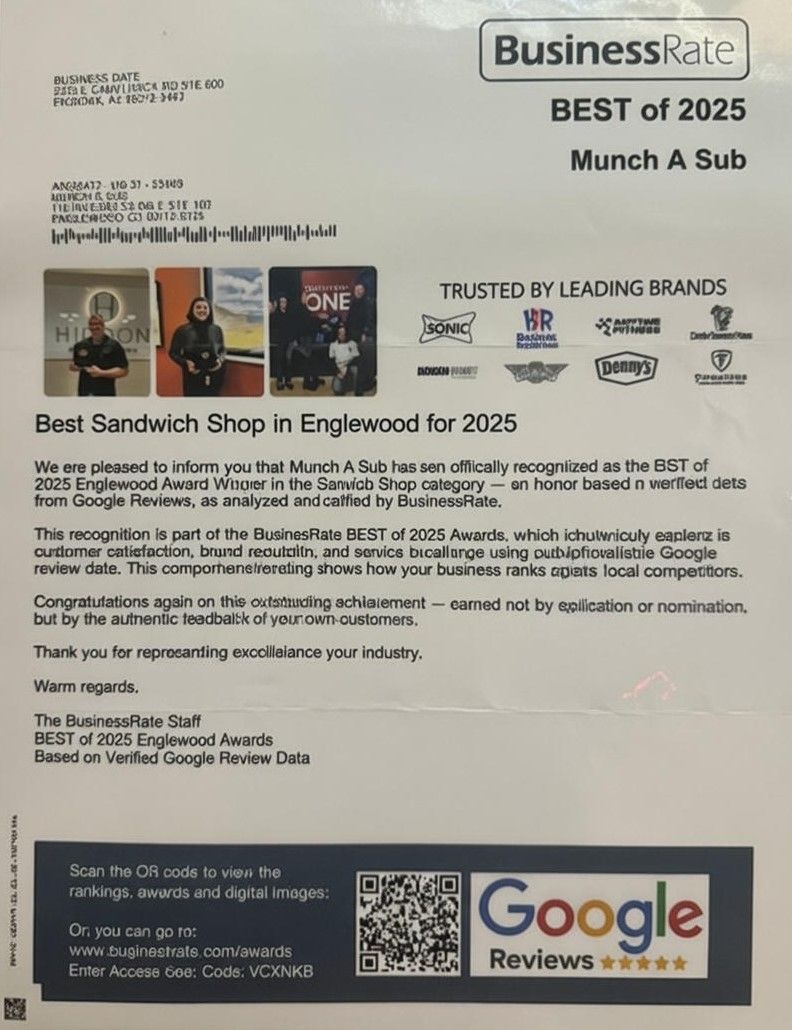 We're proud to announce that Munch A Sub has been honored as the Best Sandwich Shop in Englewood for 2025 by BusinessRate!