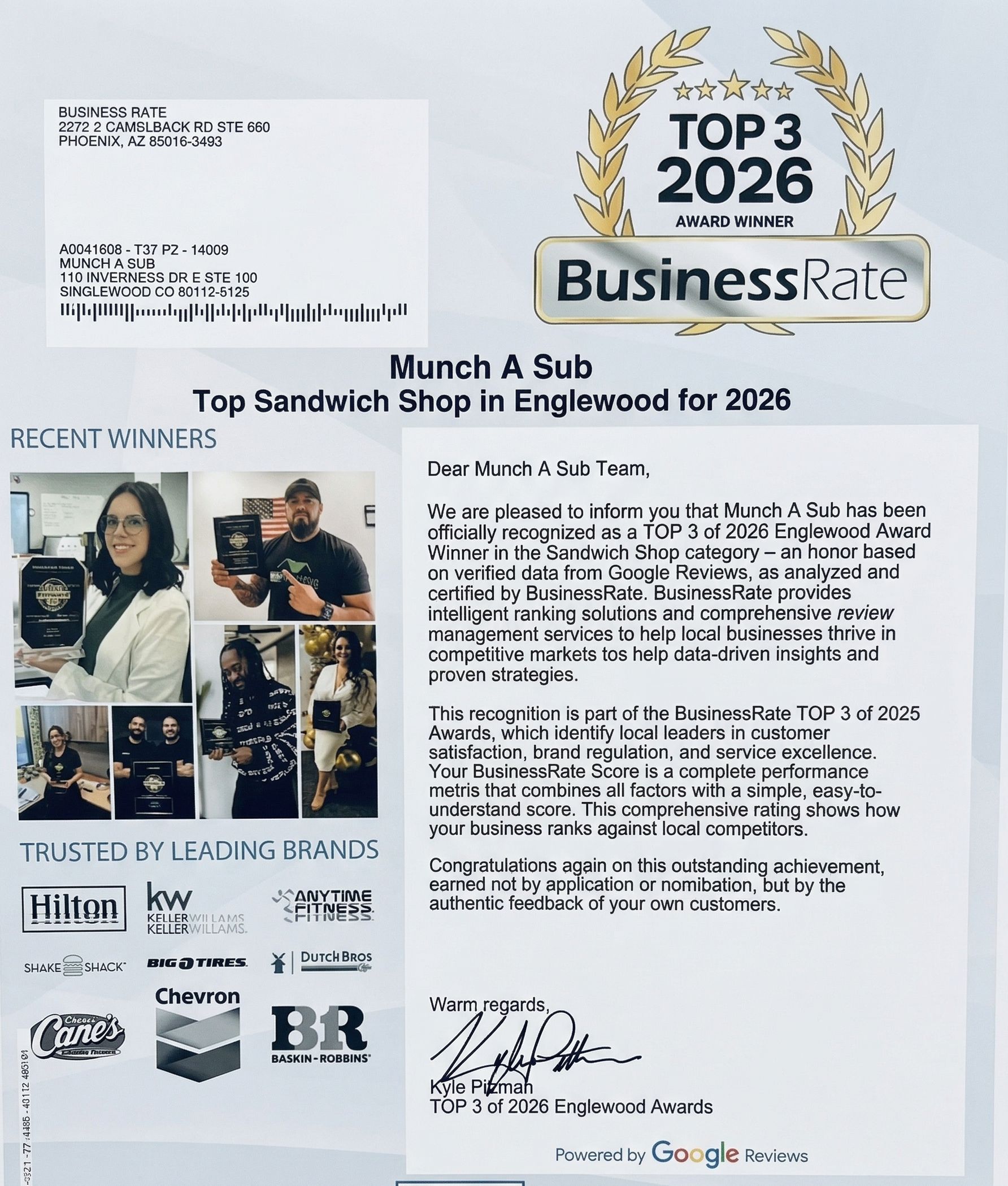 We're proud to announce that Munch A Sub has been honored as the Best Sandwich Shop in Englewood for 2025 by BusinessRate!